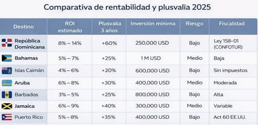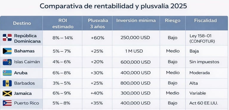 República Dominicana combina la rentabilidad más alta con la fiscalidad más favorable y el menor nivel de riesgo, situándose como el epicentro de la inversión inmobiliaria premium en el Caribe. Esta ventaja estructural, junto con su crecimiento sostenido del PIB (superior al 5 % anual) y la estabilidad jurídica, la posicionan por encima de otros mercados regionales.