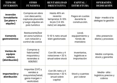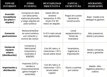 Este cuadro te ayuda a decidir rápido dónde poner tu dinero según lo que más valoras: rentabilidad, esfuerzo operativo y necesidad de capital. Úsalo para comparar de un vistazo y priorizar la opción que mejor encaja con tu perfil y objetivos. Si tienes dudas, parte de esta base y ajusta con tus propios números.
